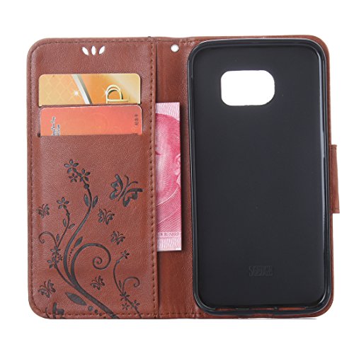 WindTeco Cover Galaxy S6, Fiore Farfalle Sbalzato Design Flip Custodia in Pelle PU Protettiva Portafoglio Case con Porta Carte e Funzione Stand per Samsung Galaxy S6, Marrone