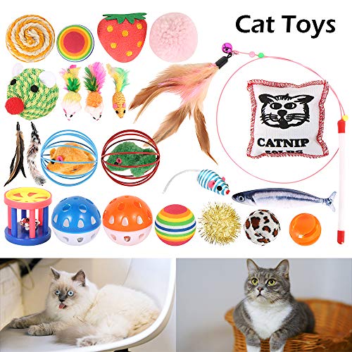 23 Pezzi Giocattoli Diversi: Include 4 topolini, 13 palline varie, una pesce, un sonaglio, un cuscinino e una bacchetta per gatti con 2 pezzi di piuma per sostituire.