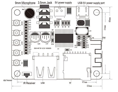 Audio input: 1. Bluetooth audio reception 2. USB decoding playback 3. TF card decoding 4. FM radio (need to welding wire antenna)