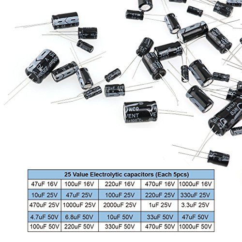 WINGONEER 25 Valori 16V 25V 50V 1uF a 2200uF Condensatori elettrolitici Assorted Kit Assortimento Set Nero - 125PCS
