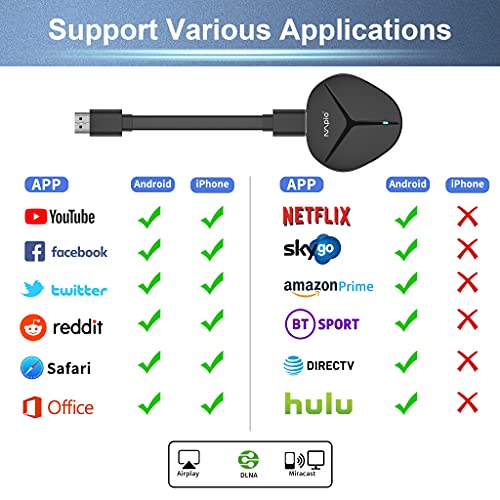 【Compatibilità universale superiore】 Questo adattatore display wireless è compatibile con il sistema OS/Android/Windows/Mac OS, adatto per i-Phone, i-Pad, Mac book, Huawei, Xiaomi, OPPO, Samsung, LG, HTC, PC e ecc. alla TV, al proiettore, al monitor o ad altri dispositivi compatibili dotati di HDMI. Supporta la funzione Miracast/Airplay/DLNA.