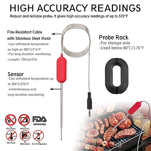 Rilevamento della temperatura a canali e ampia gamma di applicazioni - viene fornito con 4 sonde in silicone con codice colore. È possibile collegare 4 sonde e monitor 4 diversi tipi di cibo al tempo stesso. che si tratti, grill, forno, barbecue, forno, caffè o riscaldamento dell' acqua, più sonde, rendere la vostra cucina più professionale. Nota: la temperatura massima, il cavo di sonde possono sopportare è 716 ℉. Si prega di non lasciare il cavo in forno o fumatore in cui la temperatura è superiore ai 716 ℉.