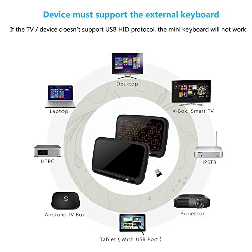 Tastiera retroilluminata 2.4 GHz mini - funziona fino a 10 m di distanza dalla tastiera touch, è possibile porre sul letto o divano a guardare la TV. Illuminazione con 3 livelli di regolazione retroilluminazione a LED, non solo potete utilizzare questa tastiera di notte con altri chiuso, (non necessita di saltare fuori del letto o divano per accendere le luci, per non disturbare gli altri), ma anche per godersi il buon umore e meravigliosa esperienza che porta. La delicata e nobile telecomando tastiera gioca un buon ruolo nella vostra casa.