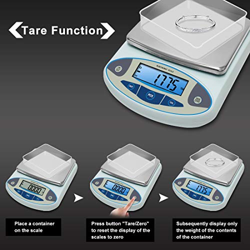 Bilancia multifunzionale da laboratorio/cucina - la funzione PCS consente il conteggio degli oggetti identici. Funzione tara è di pesare il peso del contenuto del contenitore. Premendo il pulsante "Unità", è possibile cambiare facilmente l'unità di pesatura all'interno di g, ct, oz e lb. Premendo il "CAL"" si può ottenere l'auto-calibrazione, migliorando la precisione dell'equilibrio. Il display LCD retroilluminato e l'indicazione di sovraccarico porta più convenienza.