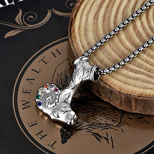 ❤ Dimensioni Mjolnir: 21 * 28 mm, peso: 6,2 g, lunghezza catena 2,5 mm 55 cm, pietra infinita: rosso viola arancione giallo verde blu zirconia