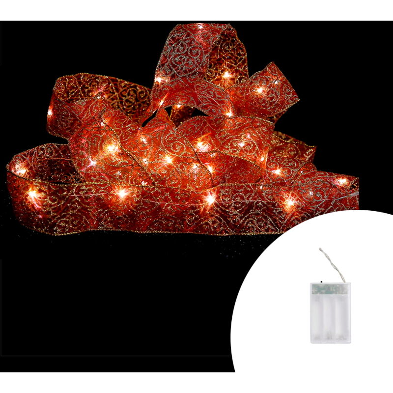 Nastro Toulle di colore rosso con ricami dorati per decorare alberi di natale, caminetti, vasi, colonne ed ogni tipo di decorazione che si voglia illuminare o che non sia raggiungibile da corrente elettrica, 50 Microled diametro 1,5mm distanti 10 cm l'uno dall'altro, Temperatura Colore Bianco Caldo, alimentato da 3 batterie AA (non incluse), a luce fissa ed intermittente, lunghezza 5 metri, larghezza 6 cm per uso interno con possibilità di uso esterno solo se il controller non è direttamente esposto ad agenti atmosferici.