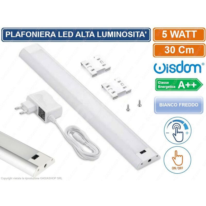 Reglette lineare con potenza di 5W equivalenti a 25W di una lampada ad incandescenza. Corpo ultra sottile, realizzato in materiale plastico bianco e alluminio, con copertura opaca. Plafoniera da 30cm. Tecnologia LED SMD con Fascio luminoso di 160° e Flusso luminoso di 380 lm. Rapporto di 76 lm/W. Grazie all'accenzione tramite gesture touch è possibile accenderla, spegnerla e regolare la luminosità tramite il solo passaggio della mano. Ottima da utilizzare come illuminazione sotto-pensile senza l'utilizzo di interruttori, Nella confezione riceverete le staffe con le viti per il fissaggio a parete e l'alimentatore completo di jack di connessione. Disponibile con temperatura colore: Luce Bianca Fredda 6500K . Dimensioni: 300 x 40 x 10 mm.