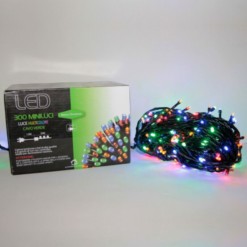 Wisdom Christmas Line. Catena luminosa composta da 300 LED Multicolore con controller per 8 giochi. Ideale per decorazioni interne ed esterne di alberi di Natale, siepi, decorazioni verdi in pvc, balconi, vetrine etc. Caratteristiche: - Catena luminosa. - Colore luci: Multicolore. - Colore cavo: Verde. - Numero di luci Led: 300 LED. - Giochi di luce: 8 giochi di luce con controller. - Uso interno e esterno. - Dimensioni: 24 metri. - Consumo Watt: 90% in meno della classica lampadina. - Prolungabile: no. - Valutazione IP: IP44. Per uso esterno il controller e la spina vanno protetti con il guscio di protezione art. 74985 disponibile sul nostro sito ed acquistabile SEPARATAMENTE da questo prodotto.