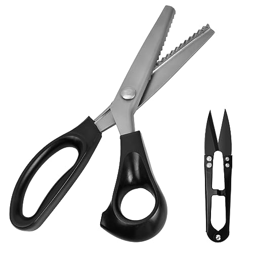 Wisebom Forbici Zig-Zag con Tagliafilo, Forbici Seghettate Professionale in Acciaio Inox con Comoda Maniglia Nero Cesoie Dentellate Seghettate da Sarto Affilato 23.5cm per Stoffa Sartoria Tagliare