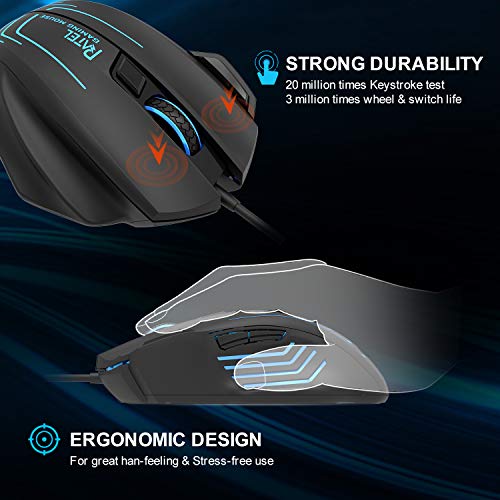 【DESIGN ERGONOMICO E AMICO DELLA PELLE】 C'è un'area di appoggio per il pollice sul lato sinistro del mouse e due aree di appoggio per le dita sul lato destro, offre un comodo design con impugnatura ad artiglio, uso a lungo termine senza fatica. La scelta migliore per i giocatori di giochi per computer con anti-impronte digitali e resistente al sudore che può mantenere saldamente la presa durante il gioco. Eccellente mouse da gioco per PC cablato per giocatori occasionali.