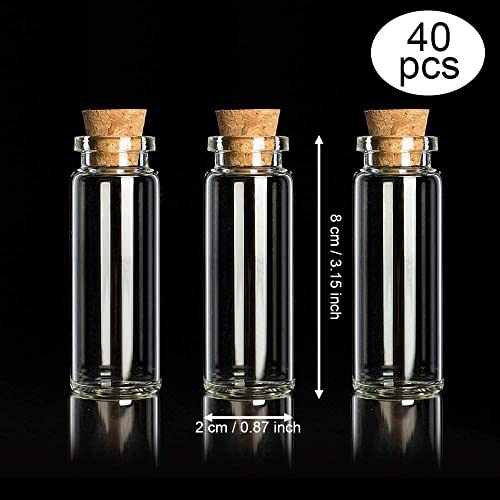 【Set di Mini Bottiglie di Vetro】- Il set contiene un totale di 40 piccole bottiglie di vetro, ciascuna bottiglia di vetro è alta circa 8 cm/3,15 pollici, larga 2 cm/0,87 pollici e ha una capacità di 20 ml. La forma è piccola e raffinata, molto leggera e facile da trasportare.Puoi usarla per imballare alcuni piccoli oggetti quando sei in viaggio, come profumi, creme, oli essenziali, gioielli.