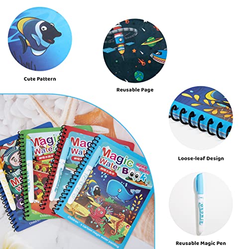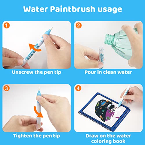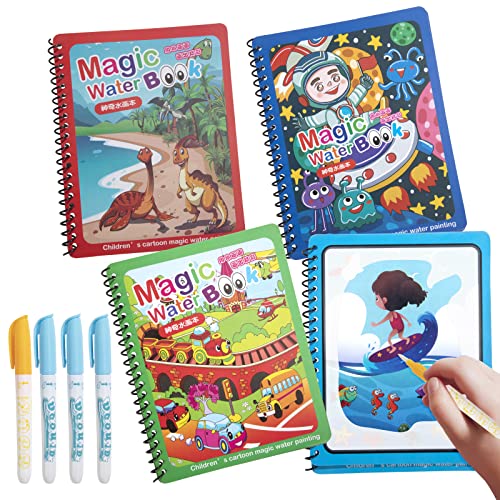 Wisplye Libro da Colorare ad Acqua, Magic Water Coloring Book con Penne, Libro da Colorare Acqua Doodle Riutilizzabile Educativo Giocattolo Regalo per Bambini Ragazzi Ragazze 2-6 Anni, 4 Pezzi
