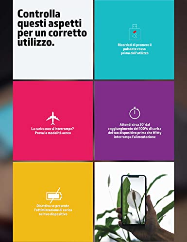 [COME FUNZIONA] Ti basta inserirlo tra il caricabatterie ed il cavo di ricarica del tuo dispositivo. Premendo il tasto di accensione, Witty si prenderà cura della tua batteria. TIPS PER OTTIMIZZARE LA RICARICA: utilizza la modalità aereo o disattiva le antenne non necessarie, ottimizza i consumi delle applicazioni e disattiva la ricarica ottimizzata nel tuo dispositivo (se disponibile).