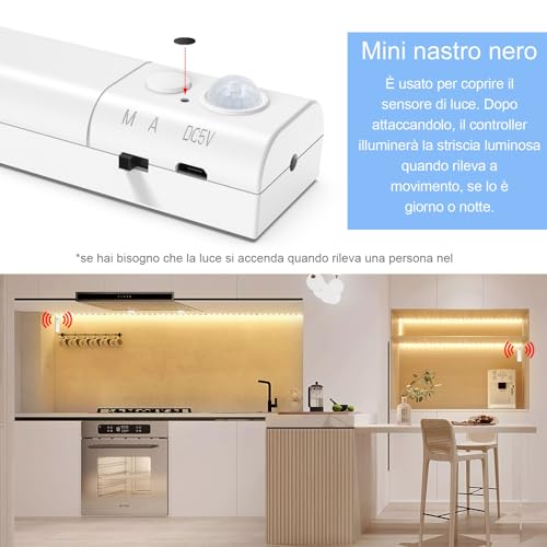 WOBANE Striscia Led per Scale Interne con Doppio Sensore di Movimento, 5 metri Strisce Led Batteria Ricaricabile, Led Striscia Adesive Pile per Cucina,Armadio,Corridoio,Letto, Bianco Freddo 6000K