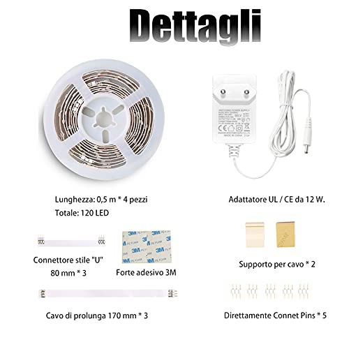 【Design di Giunzione】La barra di luce bianca calda Wobsion LED 2M è divisa in quattro parti, ovvero 4 x 50 cm, inclusi 3 connettori a "U" e 3 connettori diritti (18 cm), puoi installarla in base alla tua posizione