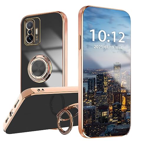 WOBURN Cover per Xiaomi Mi 11T 5G / Xiaomi Mi 11T Pro 5G con Girevole Anello, Custodia in Morbida Silicone TPU Bordo Dorato Della Placcatura Anti-Graffio Antiurto Protettiva - Nero