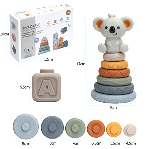 【piccola sorpresa】Questo Impilabili Bambini Un set di 1 * koala + 6 * anelli di gomma morbida + 6 * quadrati di gomma morbida, Soddisfa il gioco quotidiano del bambino, Giocattolo massaggiagengive C'è un piccolo foro nella parte inferiore di ogni cerchio morbido, ci sarà un cigolio suono quando i bambini premono i delicati anelli di impilamento. e migliorare la sensibilità del bambino.