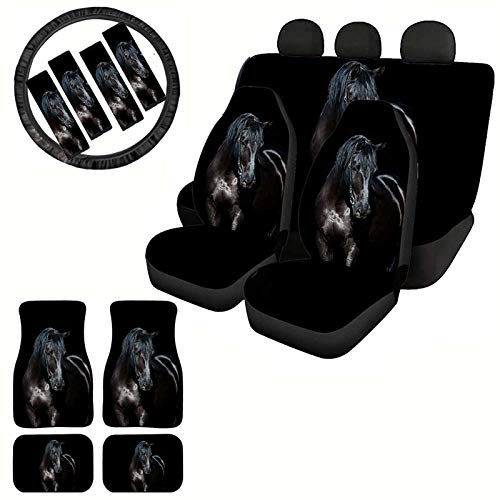 Woisttop, set di accessori interni auto stampa cavallo 13 pezzi, 4 coprisedili+2 tappetini anteriori+2 tappetini posteriori+1 coprivolante+4 cuscinetti per cinture di sicurezza, misura universale