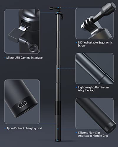 【Alta compatibilità】Questo selfie stick ricaricabile è compatibile con la maggior parte delle action cam sul mercato, come WOLFANG/Gopro/Insta 360/VICTURE/Akaso/APEMAN/COOAU/APEXCAM e molte altre. Se hai bisogno di caricare la Gopro con l'interfaccia di ricarica Type-C, devi acquistare un ulteriore adattatore da USB a Type-C. Funziona anche con la maggior parte degli iPhone e dei telefoni Android.