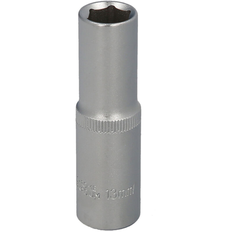 Chiave a bussola esagonale 1/2 lunga 13 mm. Caratteristiche aggiuntive: Misura: 13 mm. Profilo interno a 6 facce. Realizzata in acciaio al Cromo Vanadio, garantendo maggiore durezza e resistenza. Conforme alla normativa DIN 3124. Bordi arrotondati.Con zigrinatura per una presa ottimale sul cricchetto. Sopporta coppie di serraggio elevate con un'usura minima.