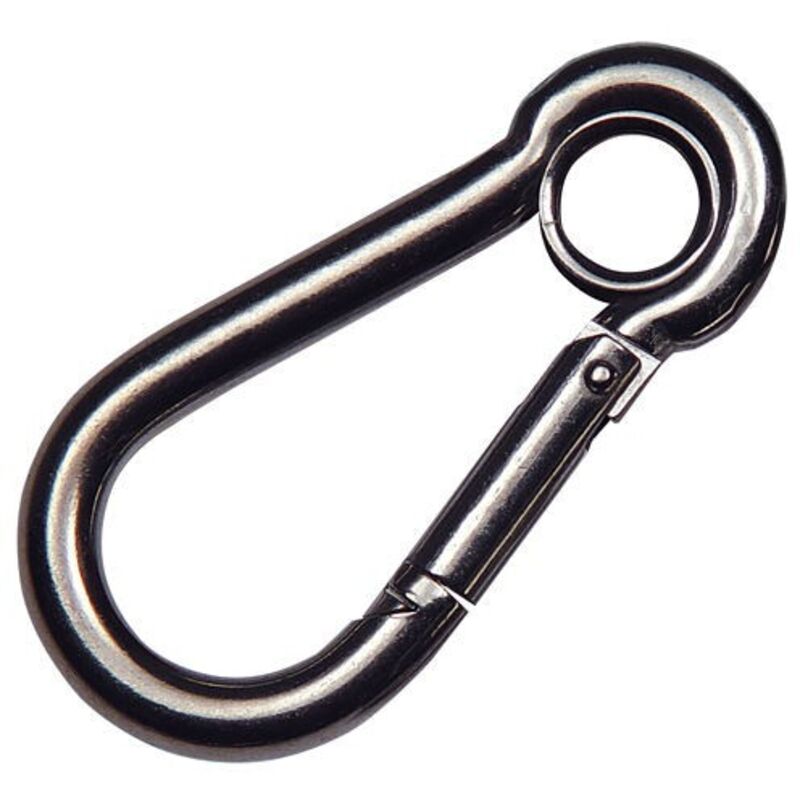 Moschettone pompiere in acciaio inossidabile - Misura: 60 mm. - Realizzato in acciaio inossidabile. - Con occhiello. - Uso domestico. - Non dovrebbe essere utilizzato in attività professionali come il trascinamento o il fissaggio di carichi.