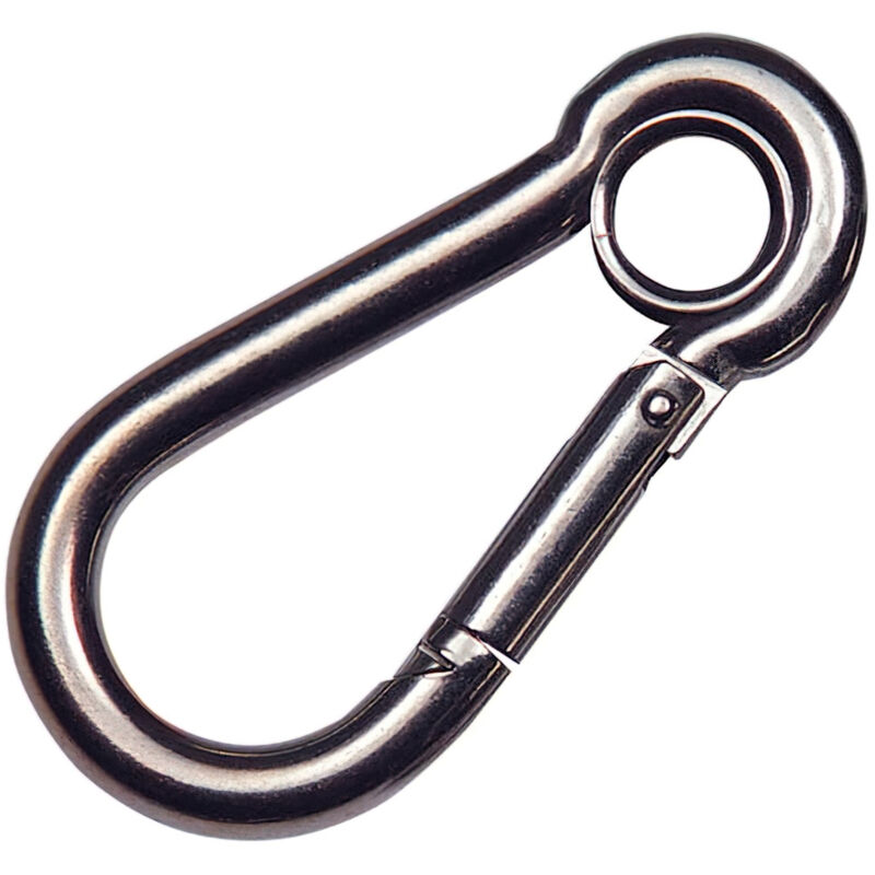 Moschettone pompiere in acciaio inossidabile - Misura: 80 mm. - Realizzato in acciaio inossidabile. - Con occhiello. - Uso domestico. - Non deve essere utilizzato in attività professionali come il trascinamento o il fissaggio di carichi.