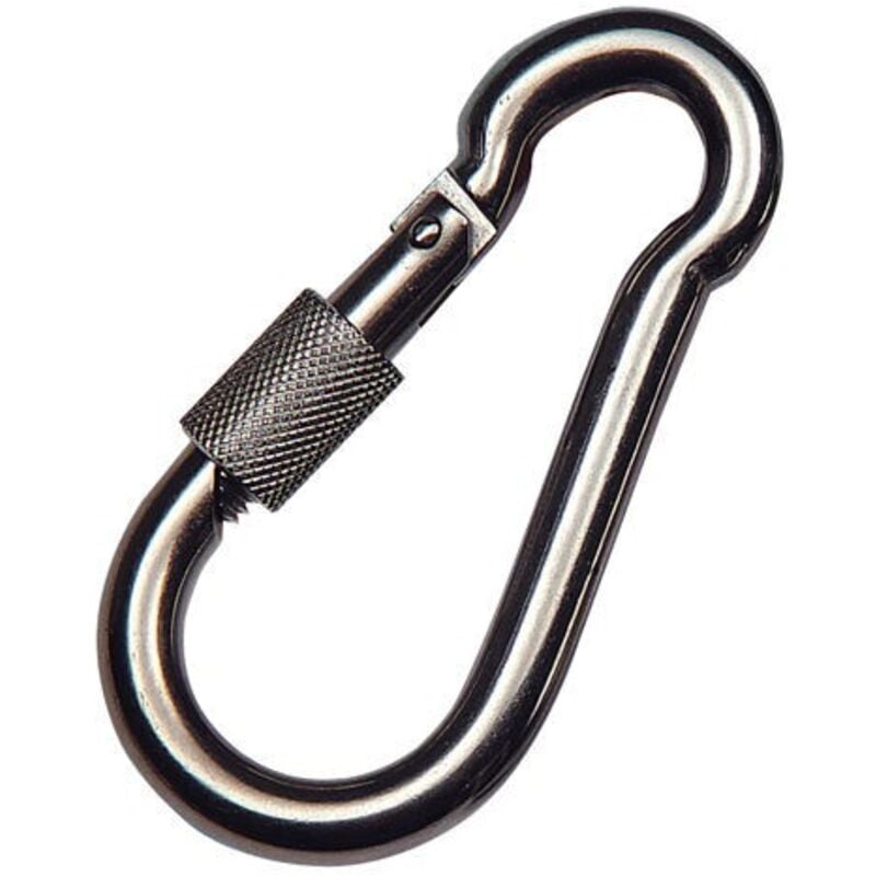 Moschettone pompiere in acciaio inossidabile con sicura - Misura: 60 x 6 mm. - Realizzato in acciaio inossidabile. - Con anello di sicurezza. - Uso domestico. - Non dovrebbe essere utilizzato in attività professionali come il trascinamento o il fissaggio di carichi.