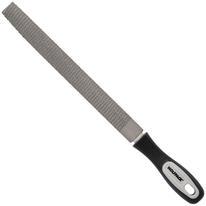 Raspa da ebanista Wolfpack con manico. - Forma semicircolare semicircolare. - Lunghezza: 250 mm./10. - Finitura media, per lavori di levigatura e finitura. - Semitonda: doppia funzione, lato piatto per superfici piane o convesse e lato curvo per superfici tonde o concave.