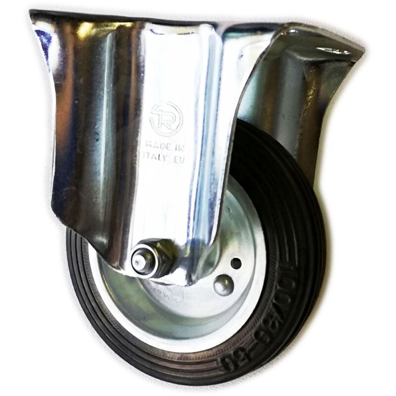 Ruota in gomma nera, supporto industriale. - Diametro: 125 mm. - Larghezza ruota: 25 mm. - Dimensioni piastra: 100x85 mm. - In gomma.