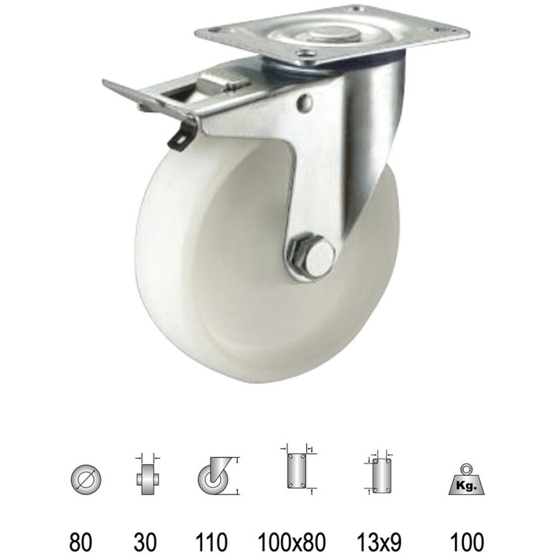 Ruota industriale Piastra in nylon con freno 80mm Ø: 80 mm. Larghezza: 30 mm. Portata: 100 Kg. - Dimensioni piastra: 100x80 mm. - Dimensioni foro piastra: 13x9 mm. - Interasse fori: 80x60 mm. - Altezza ruota: 110 mm.