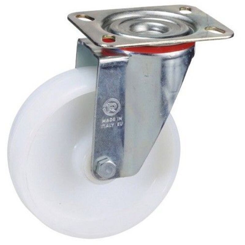 Ruota monoblocco in poliammide, supporto industriale. - Diametro: 125 mm. - Larghezza ruota: 40 mm. - Dimensioni piastra: 100x85 mm. - Realizzata in nylon.