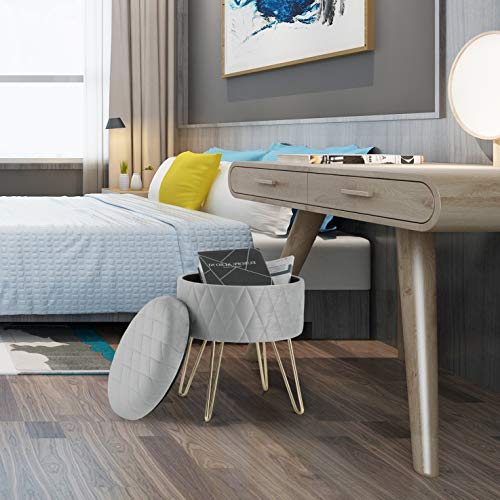 WOLTU SH63hgr Sgabello Basso per Ingresso Salotto Contenitore Rotondo con Coperchio Rimovibile Poggiapiedi di Velluto Grigio Chiaro