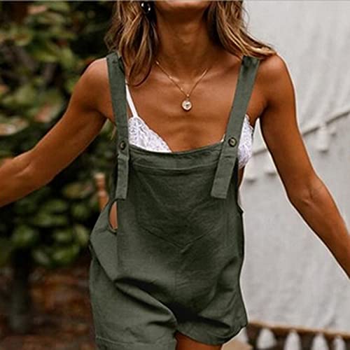 Women's Casual Cotton And Linen Short Overalls Jumpsuits Solid Color Square Collar Sleeveless Rompers Dungarees (Army Green, Large)