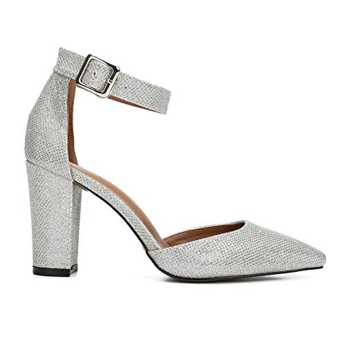 Women's Strap Heels Elegant D'Orsay Closed Pointed Toe Pumps Block Chunky High Heel Court Shoes Silver sequins-43