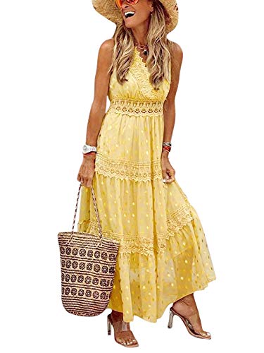 WonderBabe Abito Ricamato con Scollo a V e Spalline per Le Donne Senza Maniche Backless Bottone di Perle Abiti Casual da Spiaggia Larghi Giallo Taglia S