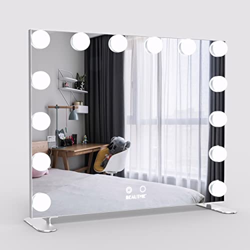 Specchio trucco con luce LED: la dimensione totale dello specchio per il trucco grande è: 60 x 52,5 e la dimensione del vetro è di 60 x 50 cm. Ha 14 lampadine di alta qualità, 2 colori di luce, illuminazione regolabile. Perfetto per il trucco in qualsiasi ambiente, a casa o in modo professionale