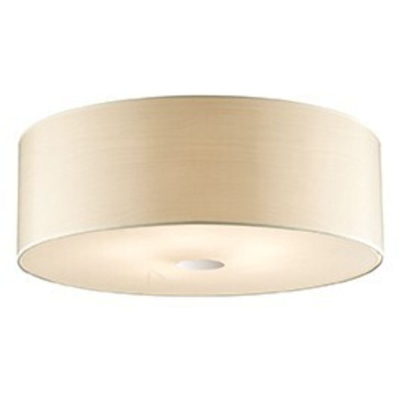 Lampada a soffitto con montatura in metallo cromato e diffusore in pvc, chiuso sul fondo da vetro trasparente acidato.