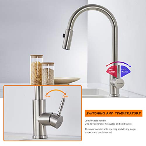 Due modalità di getto dell'acqua: 2 modalità di impostazione ( il getto da normale, il getto da potente) per lavare le verdure, pulire il lavello o riempire i vasi.con doccetta estraibile garantisce la massima libertà di movimento in cucina.