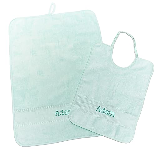 Woolove - Set asilo personalizzato con nome della tua bambina o del tuo bambino | Asciugamano Asilo e Bavaglino con Elastico | In Ciniglia di Cotone | Pratica Idea Regalo |Verde