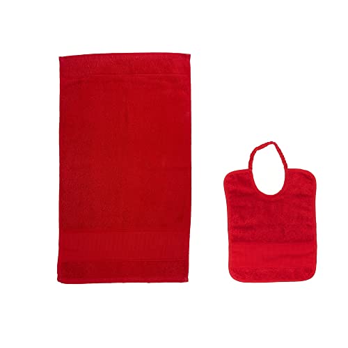Woolove - Set asilo personalizzato con nome della tua bambina o del tuo bambino | Asciugamano Asilo e Bavaglino con Elastico | In Spugna di Cotone | Pratica Idea Regalo |Rosso
