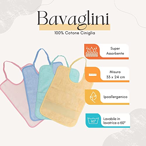 Le nostre bavaglie asilo con elastico e asciugamani asilo sono disponibili in diverse tonalità e colori pastello. L'asciugamano misura 37 X 51 cm ed è dotato di una pratica asola per appenderlo Il bavaglino misura 24 X 33 cm, in taglia unica con elastico.