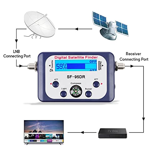 【Componenti di Alta Qualità】il misuratore di segnale dell'antenna ha un cicalino elettronico per un funzionamento semplice, istruzioni audio, luce incorporati, bussola e connettore 75Ω. Con la funzione di retroilluminazione, un display LCD retroilluminato per mostrare la potenza del segnale satellitare.