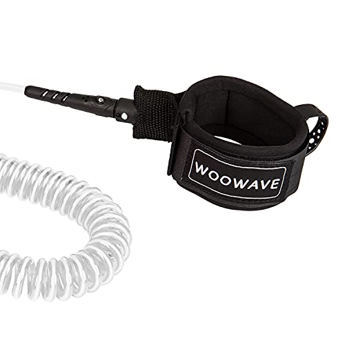 WOOWAVE SUP Leash, Premium 11 FT Coiled Surfboard Leash per Stand Up Paddle Board, SUP Corda per gambe con cinturino alla caviglia Quick Release e portafoglio impermeabile (nucleo bianco trasparente)
