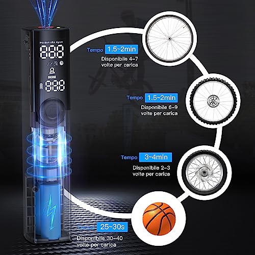 In standby per 6 mesi quando è completamente carica e non è in uso. La pompa elettrica a batteria da 120 PSI per biciclette può gonfiare le ruote di bicicletta da strada, mountain bike, bici da cross, moto, scooter, calcio, pallone da basket. È anche un mini compressore portatile per gonfiare le gomme dell'auto