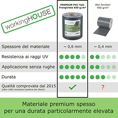 ✅ DUREVOLE E DI LUNGA DURATA - I pannelli per recinzioni da giardino di workingHOUSE sono realizzati in plastica PVC. Sono resistenti alle intemperie, resistente agli strappo, non hanno bisogno di manutenzioni e sono facili da installare. Se necessario, questi teli frangivista possono essere puliti con un tubo da giardino. Nota: Le strisce privacy in PVC hanno un lato opaco e uno lucido!