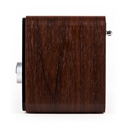 Ingresso AUX per il collegamento di dispositivi audio esterni come lettori CD o MP3 e computer | Alloggiamento bass reflex compatto con pannello frontale a specchio, impiallacciatura di legno e bordi arrotondati