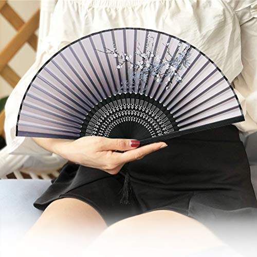 WOWOSS Ventaglio Pieghevole di Seta e Bambu, Set di Ventaglio Vintage Prugna di Pizzo Nero con Borsa di Tessuto e Scatola di Carta
