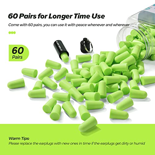 Wowteech 60 paia di tappi per le orecchie in morbida schiuma con custodia in alluminio, riduzione del rumore SNR 34dB per la protezione dell'udito, dormire, lavoro, riprese, viaggi, verde brillante
