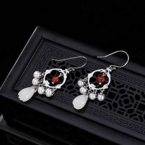 WOZUIMEI Orecchini in Stile Cinese Eardrop S925 Orecchini in Argento Sterling Naturale Nefrite Magnolia Orecchini Femminili Retrò con Perle Di Agata Rossa MeridionaleCome mostrato