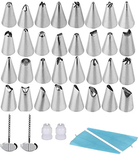 WSGQLT Kit Decorazione Torta Composto da 32 beccucci russi/cornetti in Acciaio Inox, 2 sac à Poche in Silicone, 2 accoppiatori e 2 Supporti per Fiori Piping Tips